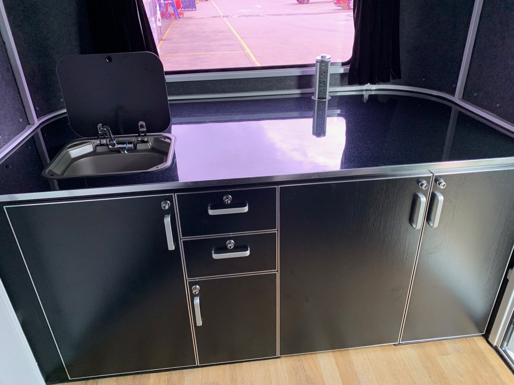 Kitchen customisation’s apply to Deluxe and Camper ranges. All Regency kitchens come set up with a wardrobe, 2 cupboards and a set of drawers. The standard colour for the kitchens is a grey wood grain. Kitchen samples include a range of wood grains, white and black.